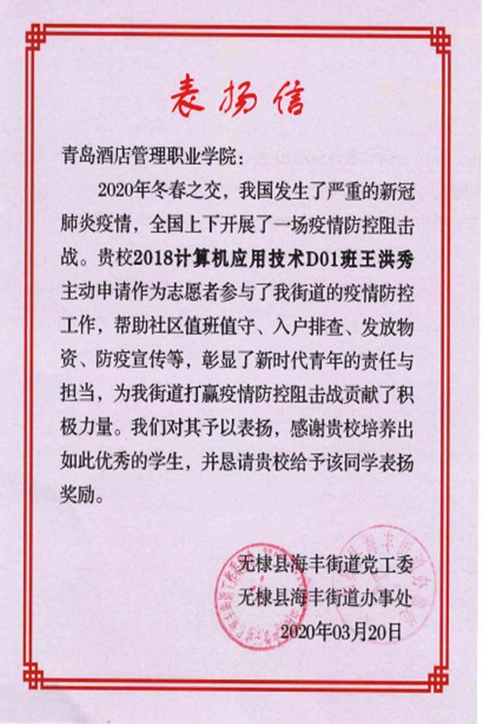 日前,青島酒店學(xué)院收到了來(lái)自濱州市無(wú)棣縣海豐街道黨工委和青島市市北區(qū)寧夏路街道發(fā)來(lái)的表?yè)P(yáng)信,贊揚(yáng)學(xué)院青年團(tuán)員王洪秀、李柞鋅作為志愿者在當(dāng)?shù)匾咔榉揽毓ぷ髦凶鞒龅呢暙I(xiàn)。