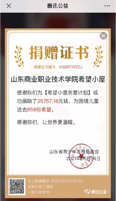 除此之外,山東商院積極響應團省委號召,聯合各二級學院開展了騰訊公益線上募捐活動,活動自開展以來得到了全校廣大青年學生的大力支持,大家紛紛獻出愛心,共籌得善款13592元。截至目前,線上線下共籌得善款25757元,均已捐贈給山東省青少年發展基金會。