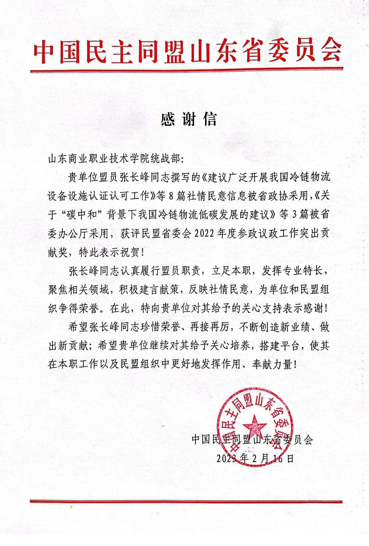 近日,民盟山東省委向山東商院發來感謝信,對學校給予民盟山東省委委員、民盟山東商院支部主委張長峰的關心支持表示感謝,對張長峰獲評“民盟省委會2022年度參政議政工作突出貢獻獎”表示祝賀。