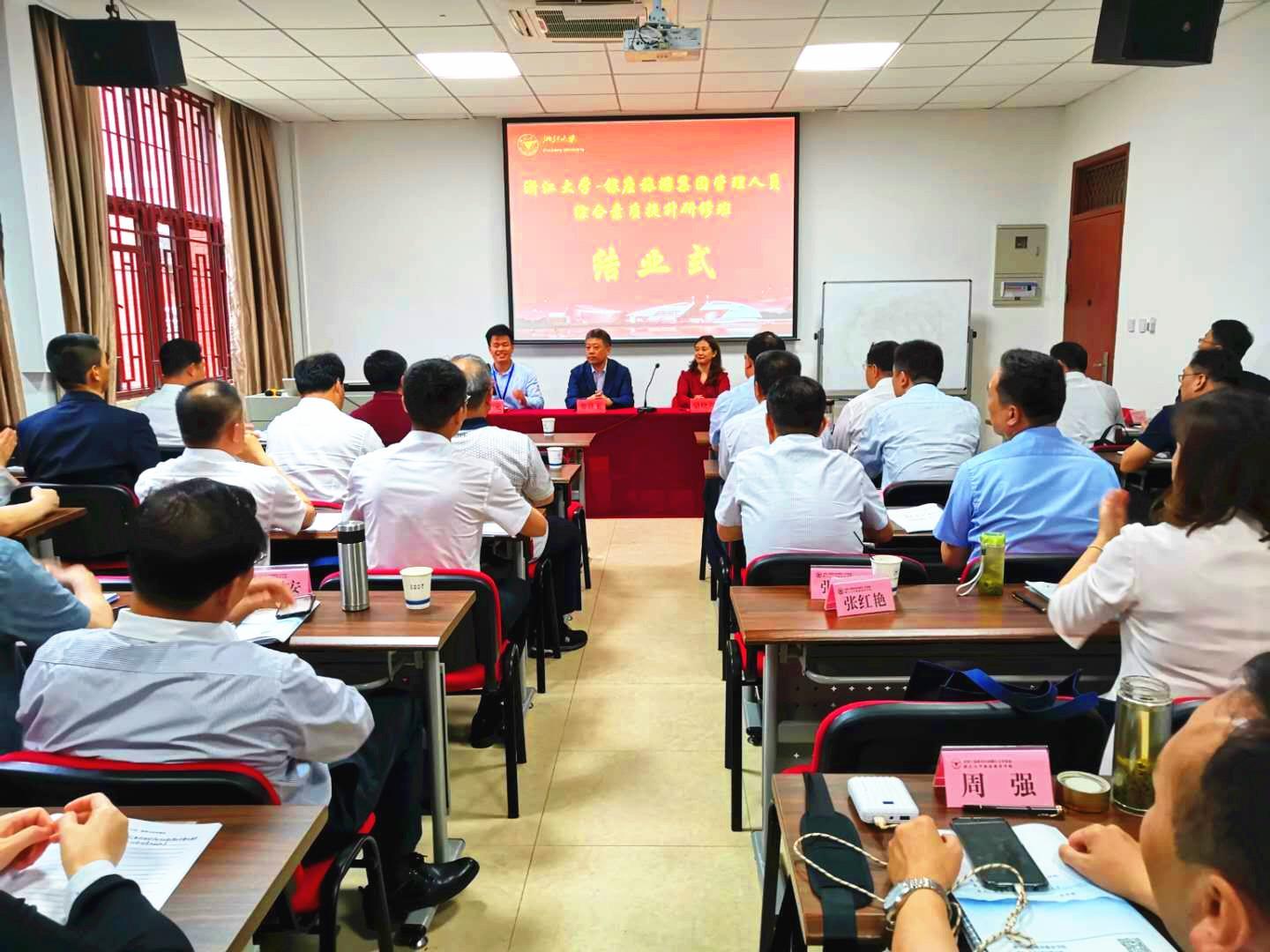 浙江大學繼續教育學院華東一區培訓部主任駱曉青作結業致辭。銀座旅游集團黨委副書記、總經理周立剛與全體學員參加結業儀式。