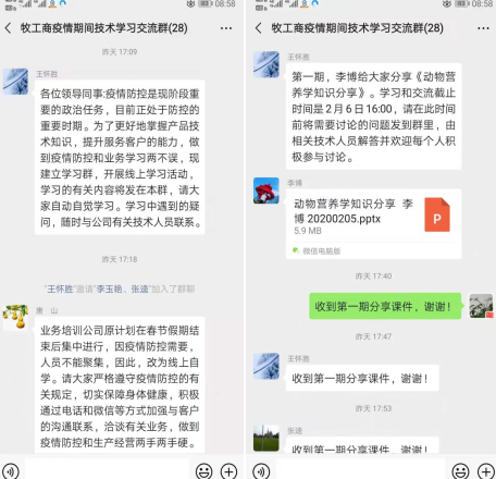 活動以“牧工商疫情期間技術(shù)學(xué)習(xí)交流”微信群為平臺,由技術(shù)人員精心準(zhǔn)備動物營養(yǎng)、產(chǎn)品知識等方面的課件,全體銷售人員在線上學(xué)習(xí)的基礎(chǔ)上,通過問答討論、答疑解惑的形式,提升學(xué)習(xí)效果。活動要求,全體銷售人員積極通過電話和微信等方式加強(qiáng)與客戶的溝通聯(lián)系,洽談有關(guān)業(yè)務(wù),做到疫情防控和生產(chǎn)經(jīng)營兩不誤。