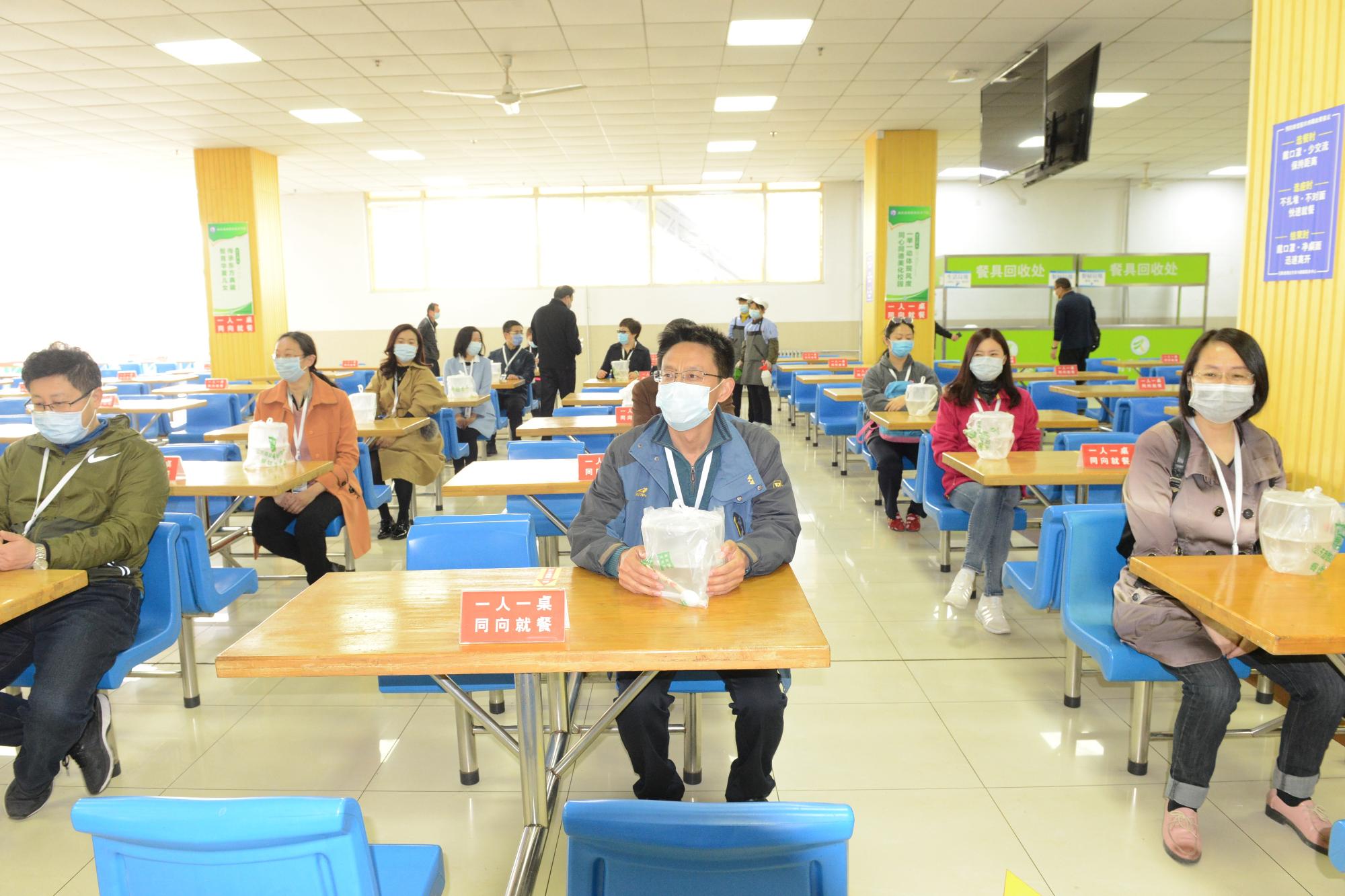 演練人員間隔1米距離,有序排隊先行測溫,經過消毒毯后進入就餐場所。按地貼提示進行洗手,洗手臺按規范放置了肥皂、消毒洗手液、紙巾等洗消物品。學生們提前了解了餐廳準備的多種套餐,間隔1米排隊進行套餐選取后分散就座,學生一人一桌同向就餐,就餐后將餐余垃圾統一扔到回收處,從指定出口離開。餐廳消殺規范,門窗氣流通暢。