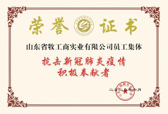 日前,牧工商被山東省飼料行業協會授予“抗擊新冠肺炎疫情積極奉獻者”稱號。