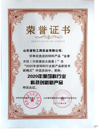 近日,由牧工商總代理并選送的飼料產品“金康無憂(天然液態大蒜素)”在“2020年度飼料行業新產品新技術新模式”評選活動中,榮獲“科技創新新產品”稱號。