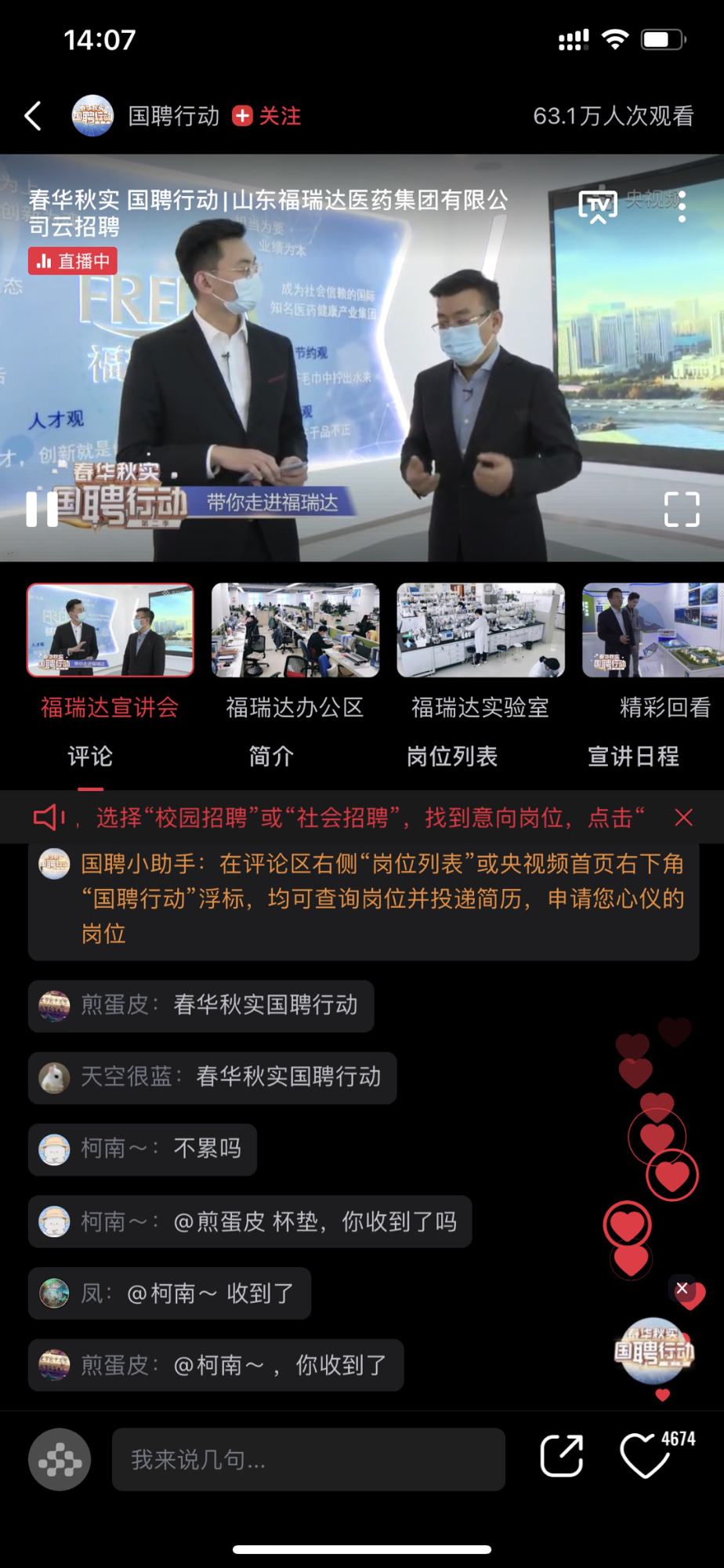 1月29日,由中央廣播電視總臺(tái)攜手教育部、人社部、國資委、團(tuán)中央共同發(fā)起,央視頻與國投人力共同主辦的“國聘行動(dòng)”第二季——“春華秋實(shí) 國聘行動(dòng)”大型融媒體招聘活動(dòng)在福瑞達(dá)總部順利舉行。