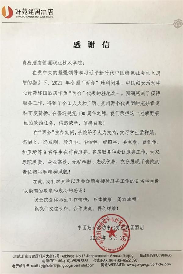 3月4日至11日,備受關注的2021年全國兩會在京召開,青島酒店學院2019級酒店管理專業(yè)在京實習的部分同學積極投入兩會服務工作中,多家酒店發(fā)來表揚信并贈送錦旗。