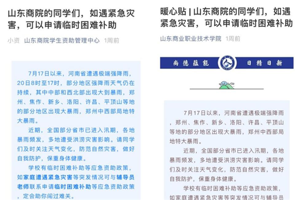 7月17日以來,河南省遭遇極端強降雨,部分地區受災嚴重。災情發生后,按照省教育廳文件要求和學校黨委指示,山東商院立即協調各二級學院摸排統計學校河南籍學生受災情況,并通過學校和學生資助中心微信公眾號發布《山東商院的同學們,如遇緊急災害,可以申請臨時困難補助》微信推文,將愛心第一時間傳遞給受災學生。廣大輔導員第一時間通過QQ、電話與河南籍學生取得聯系,并統計學生家中受災情況。