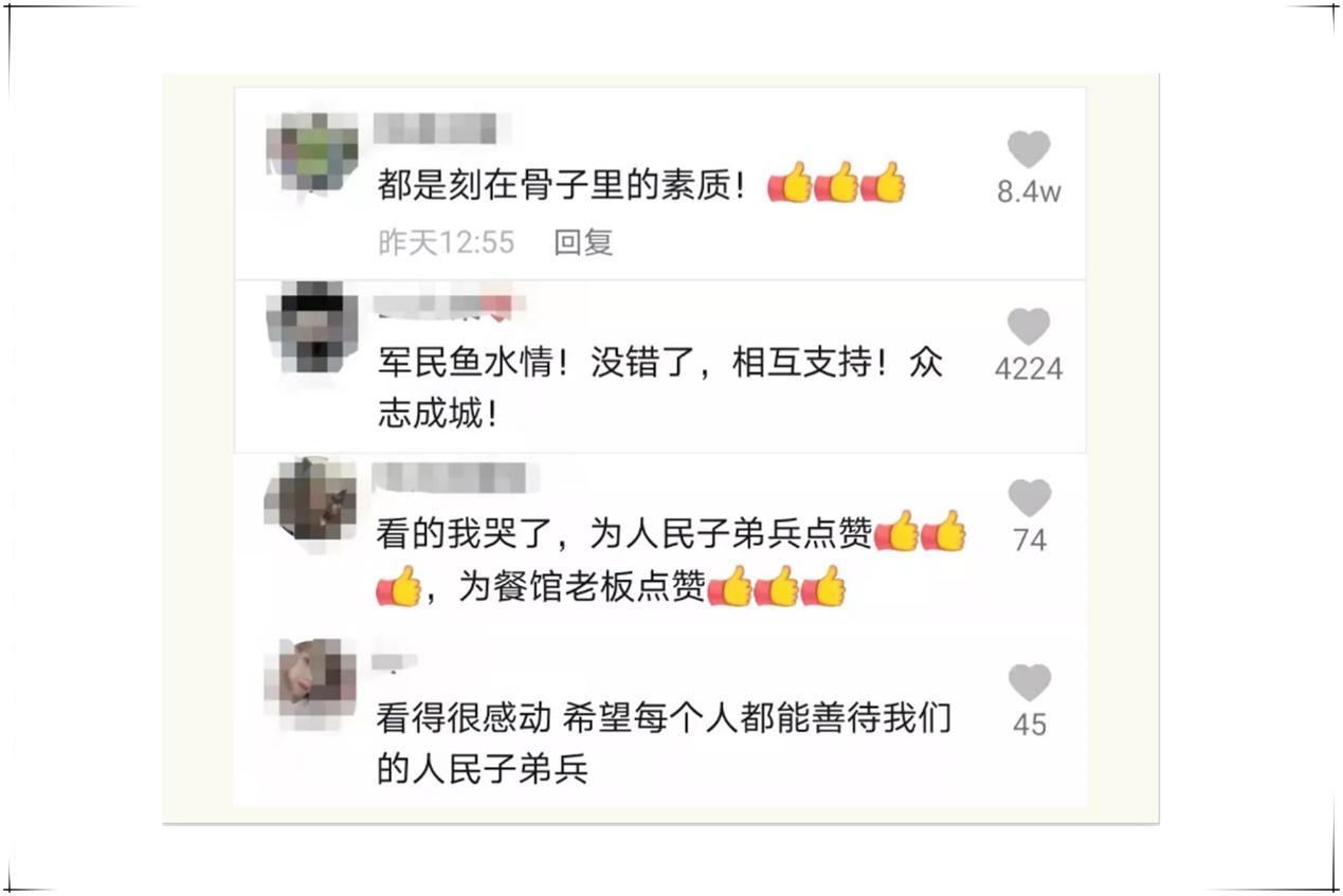視頻發出后,網友紛紛留言:“都是刻在骨子里的素質!”“軍民魚水情!…相互支持!”。大家為人民子弟兵的行為點贊也為這份軍民魚水情而感動。