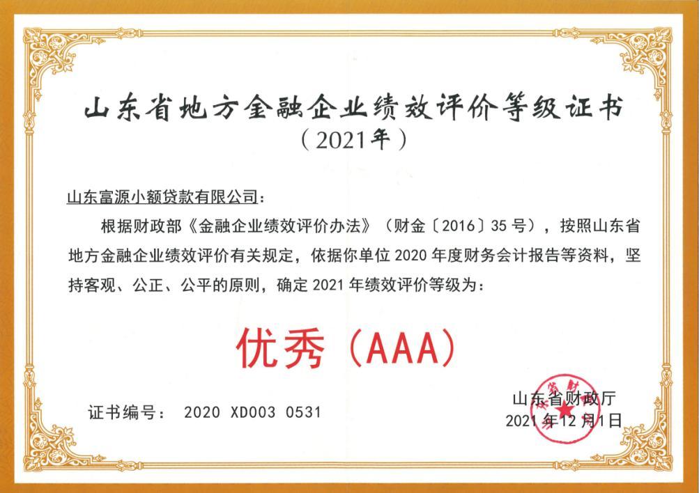 近日,省財(cái)政廳頒發(fā)2021年山東省金融企業(yè)績(jī)效評(píng)價(jià)等級(jí)證書,富源小貸獲得“AAA”優(yōu)秀等級(jí)。評(píng)價(jià)結(jié)果表示,其績(jī)效狀況在全國其他類金融企業(yè)中處于優(yōu)秀水平。至此公司已連續(xù)3年獲此最高評(píng)價(jià)。