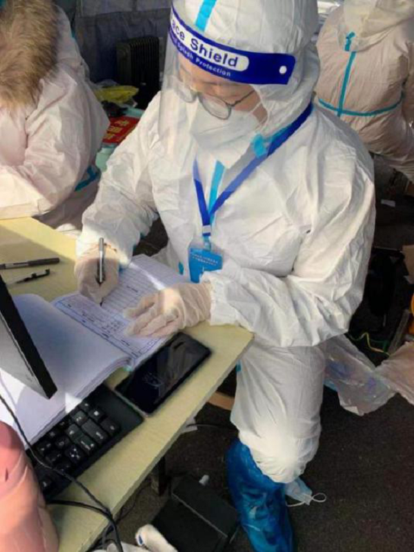 每逢集中核酸檢測的日子,蔣睿都會在清晨5點抵達現場開始準備工作,搭建帳篷、擺放隔離護欄、組裝電腦、疏通電路……嚴格確保設施、設備及時到位,正常運轉。核酸檢測工作開始后,他全程穿著防護服,佩戴N95口罩、丁腈手套、護目鏡、防護鞋套,為社區居民登記個人信息并發放核酸檢測條碼,每天服務數千名居民。核酸檢測結束后,他又不停歇地將剩余防疫醫療物資及其他設備運送到指定地點。一天志愿服務結束后,他早已是汗流浹背。