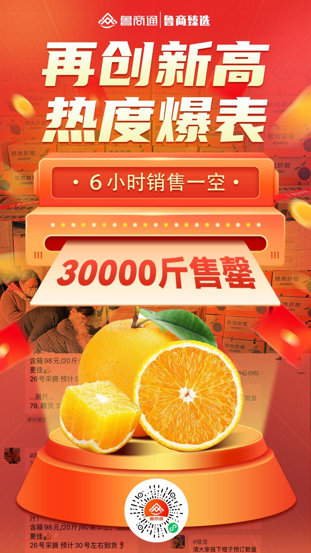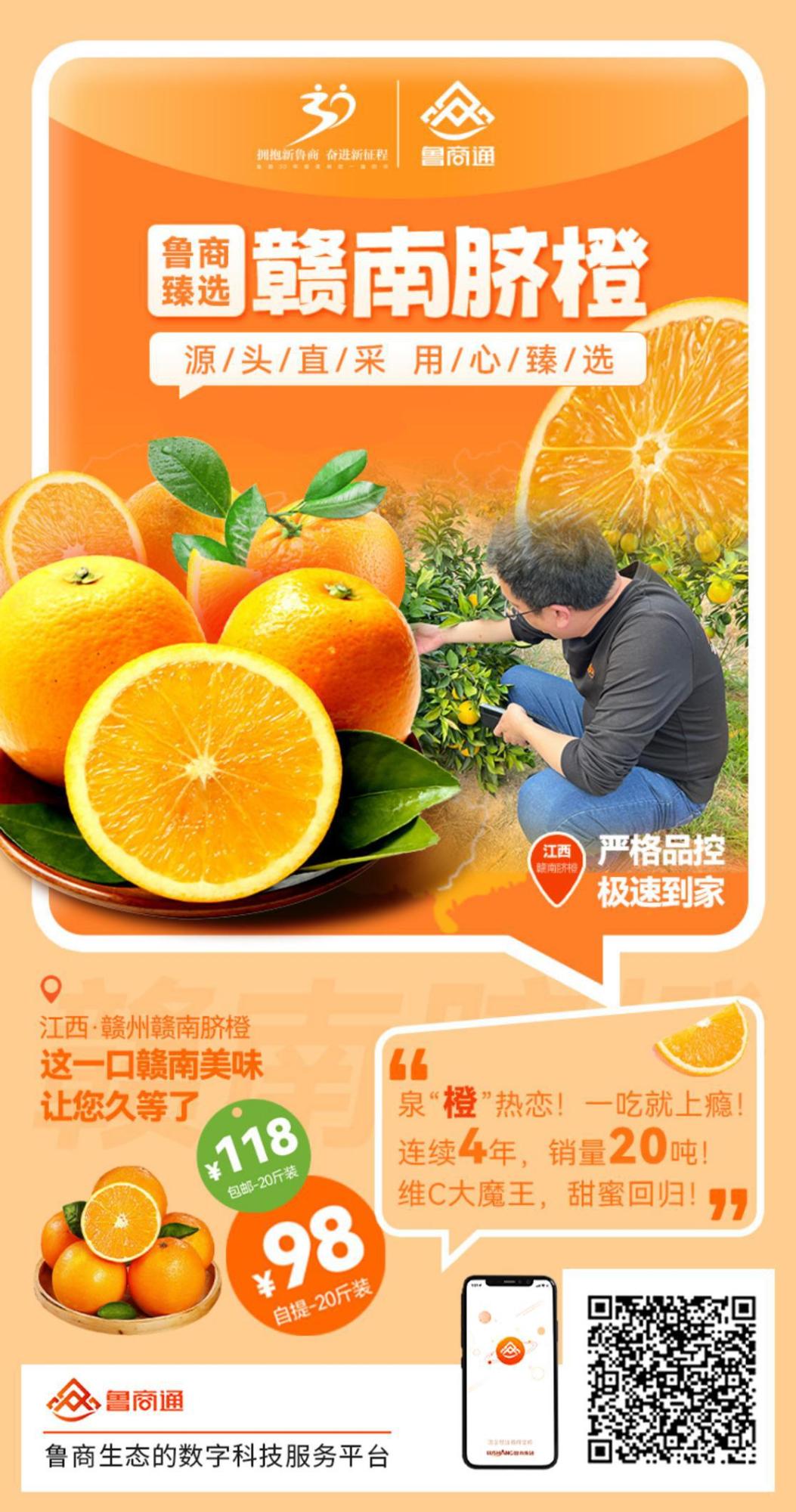 眼下正值贛南臍橙采摘旺季,為幫助果農解決疫情和天氣等因素影響導致的銷售難題,魯商通利用“社群+電商+體驗中心”等多元化方式,上線6小時即售出3萬斤,3天時間6萬斤臍橙銷售一空。