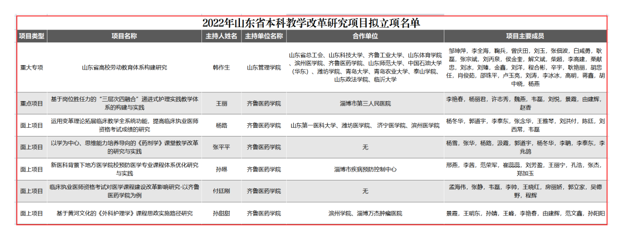 近日,省教育廳公布2022年山東省本科教學改革研究項目擬立項名單,齊魯醫藥學院共7個項目獲批立項,其中重大專項1項、重點項目1項、面上項目5項,立項率連續兩年達到100%。