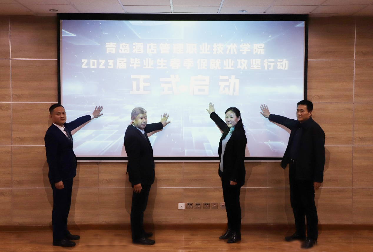 儀式上,秦冬梅、李凱偉、李達、姜玉鵬共同為青島酒店學院2023屆畢業(yè)生春季促就業(yè)攻堅行動啟幕。學校將通過開展此次行動,聚焦當前工作重點難點,挖潛創(chuàng)新開拓更多市場化崗位,抓住時機開展校園招聘,突出精準做實做細就業(yè)指導幫扶,引導畢業(yè)生主動求職,加力加快推進就業(yè)工作進程,為確保2023屆畢業(yè)生就業(yè)局勢穩(wěn)定奠定堅實基礎。