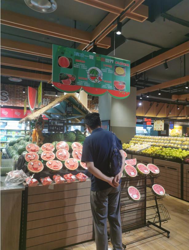 “麒麟西瓜,產地江蘇鹽城,皮薄瓤紅、水潤香甜;甜王西瓜,產自山東濰坊,紅瓤黑籽、脆甜爽口,產地直發;戰神西瓜,產地海南,品質好、甜度超群、脆嫩多汁……”初夏正值吃西瓜的好時候,現場不少市民正在精心挑選著。