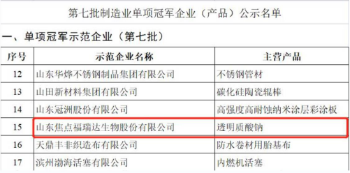 2022年10月26日,焦點福瑞達作為透明質酸鈉行業優秀企業,憑借專業化程度高、企業創新能力強以及品質理念突出等優勢,成功入選第七批國家級制造業單項冠軍企業。此前,焦點福瑞達已被認定為國家級專精特新“小巨人”、 “國家高新技術企業”、山東省瞪羚企業、山東省第六批制造業單項冠軍示范企業、山東省“一企一技術”研發中心。