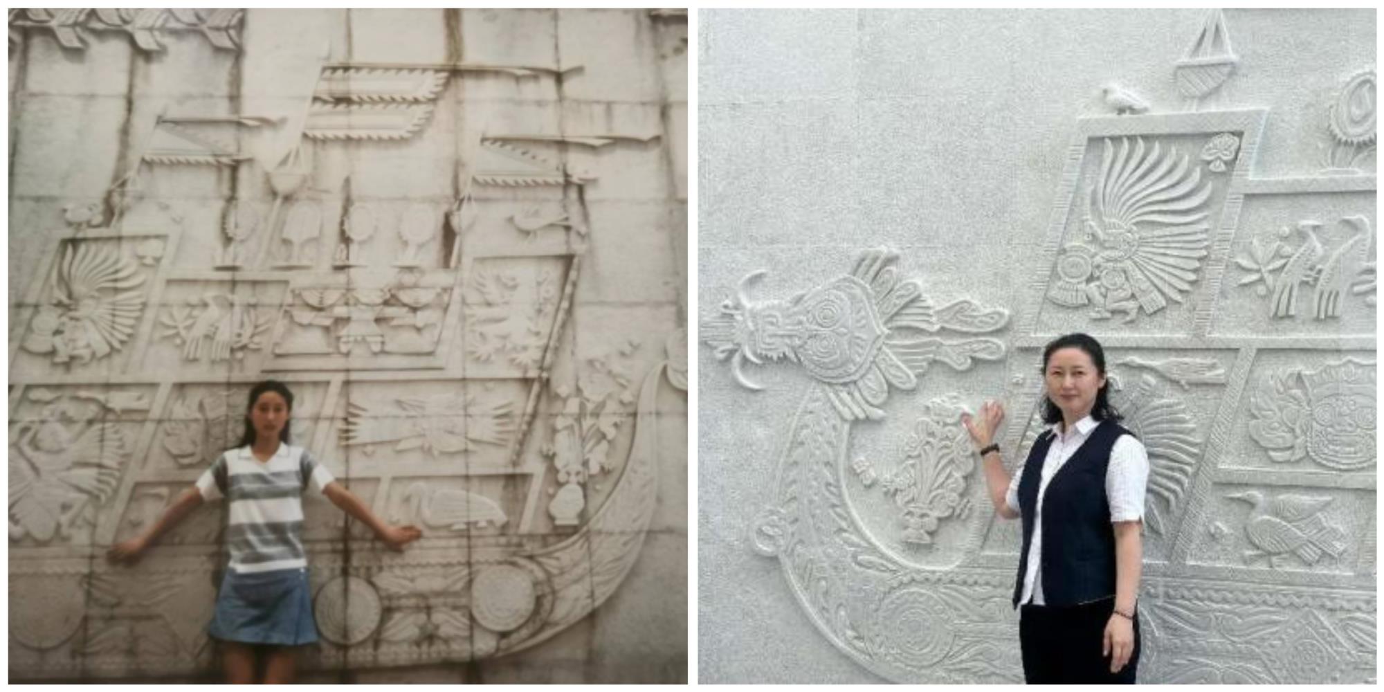 9月16日,銀座濟南商城店西下沉龍壁修復完成,已在其他門店工作的員工金輝聽聞后,特地拿著26年前的照片前來打卡留念。對她來說,這組照片不僅記錄著自己的青春流轉,更堅定了她與銀座一路前行的信心。