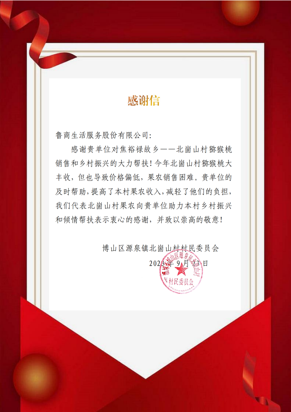 碧玉獼猴桃上市僅三天,魯商服務即幫助當地村民去化銷售6000余斤。淄博市博山區源泉鎮北崮山村村委會發來感謝信,感謝魯商服務對當地獼猴桃銷售和鄉村振興的大力幫扶,幫助果農提高了收入,減輕了負擔。