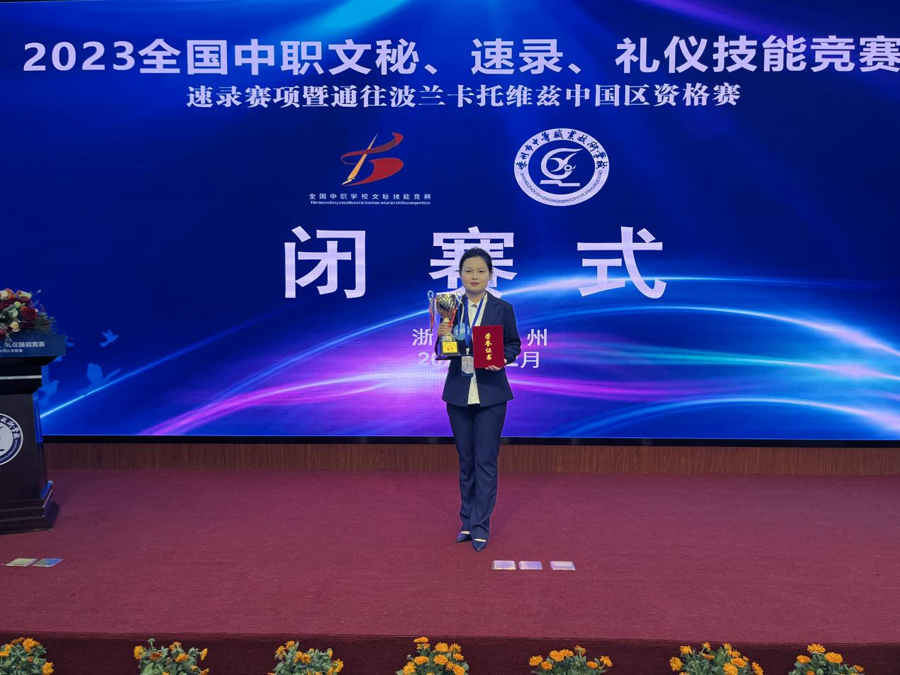 近日,2023全國中職文秘、速錄、禮儀技能競賽速錄賽項暨通往波蘭卡托維茲中國區資格賽在浙江嵊州落下帷幕。山東城市服務職院商務文秘專業選手孫雨彤以542字/分的成績,斬獲“極限看打”全國冠軍,獲得波蘭卡托維茲國際速聯大賽的入場券。