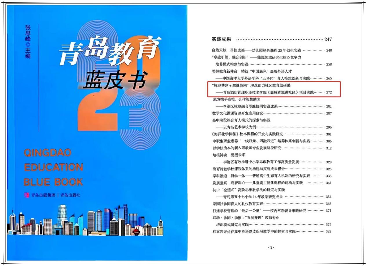 近日,《青島教育藍皮書(2023年)》出版發(fā)行,青島酒店管理職院繼續(xù)教育學(xué)院社區(qū)教育實踐成果《“校地共建+職繼協(xié)同”理念助力社區(qū)教育結(jié)碩果——青島酒店管理職業(yè)技術(shù)學(xué)院“高校資源進社區(qū)”項目實踐》入選。