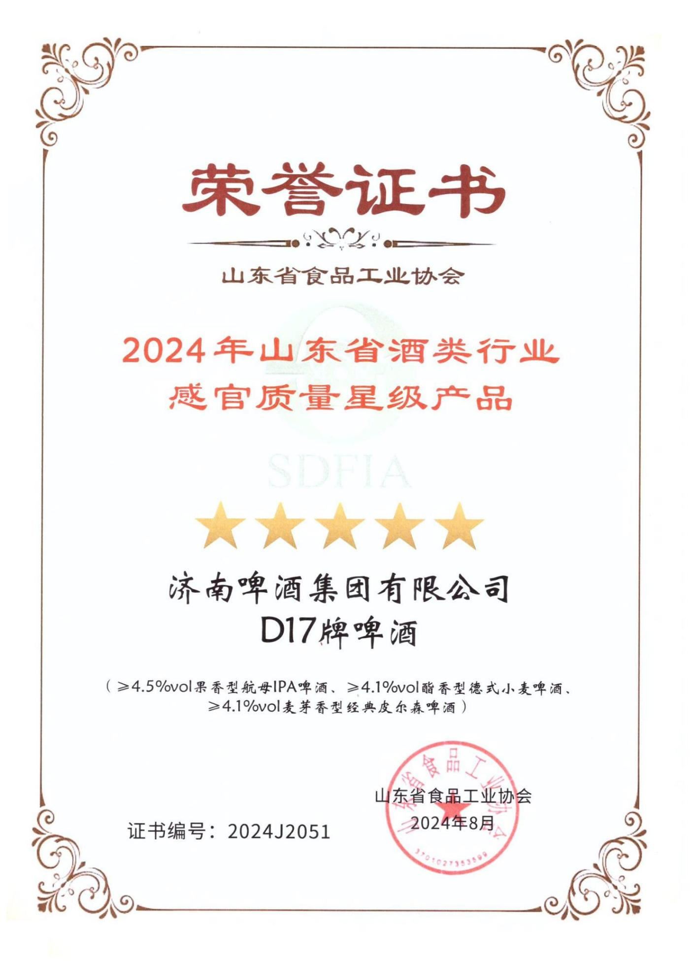 近日,在山東省食品工業協會舉辦的“2024年全省食品行業評委年會暨感官質量評價會”上,魯商投資旗下濟啤集團D17精釀啤酒憑借其卓越的品質和口感,榮獲本屆感官質量星級產品評價的最高榮譽——“5星級產品”以及“創新產品”獎。