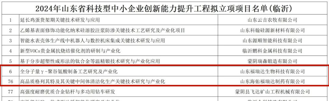 近日,福瑞達旗下福瑞達生物科技與海佑福瑞達兩家公司申報的“全分子量γ-聚谷氨酸制備工藝研究及產業化”和“高品質格列齊特及其關鍵中間體清潔化生產關鍵技術研究與產業化”兩項目成功獲得2024年省科技型中小企業創新能力提升工程立項。