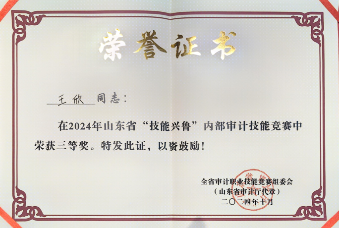 近日,全省內(nèi)部審計(jì)工作會(huì)議在濟(jì)南召開,會(huì)上通報(bào)了山東省技能興魯”2024年全省審計(jì)職業(yè)技能競(jìng)賽獲獎(jiǎng)名單。魯集團(tuán)王欣、張芮、苗楓琳參加本次競(jìng)賽榮獲團(tuán)體三等獎(jiǎng),王欣榮獲個(gè)人三等獎(jiǎng)