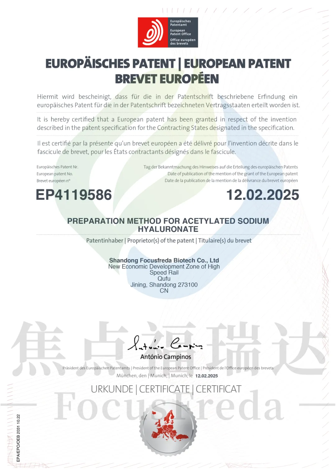 近日,焦點(diǎn)福瑞達(dá)再獲一項(xiàng)歐洲專利授權(quán)——《PREPARATION METHOD FOR ACETYLATED SODIUM HYALURONATE》(一種乙?;该髻|(zhì)酸鈉的制備方法),這一專利不僅驗(yàn)證了焦點(diǎn)福瑞達(dá)在透明質(zhì)酸鈉衍生物研發(fā)領(lǐng)域的技術(shù)領(lǐng)先性,更標(biāo)志著企業(yè)的技術(shù)創(chuàng)新能力再次獲得國(guó)際權(quán)威認(rèn)可,為強(qiáng)化品牌影響力以及全球市場(chǎng)的進(jìn)一步開(kāi)拓提供關(guān)鍵技術(shù)保障。