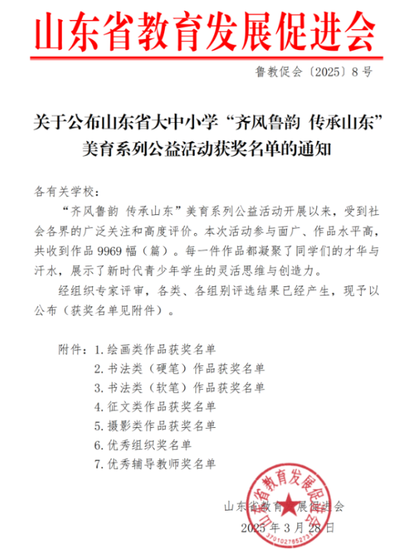 本屆大賽由山東省教育發展促進會主辦,山東省學校文化研究院等單位承辦,旨在立足深厚傳統文化資源,賡續山東文脈,弘揚傳統美德涵養文明新風。本次活動歷時三個月,共收到來自全省的投稿作品9969幅(篇),參與面廣、作品水平高,展示了新時代青少年學生的靈活思維與創造力。