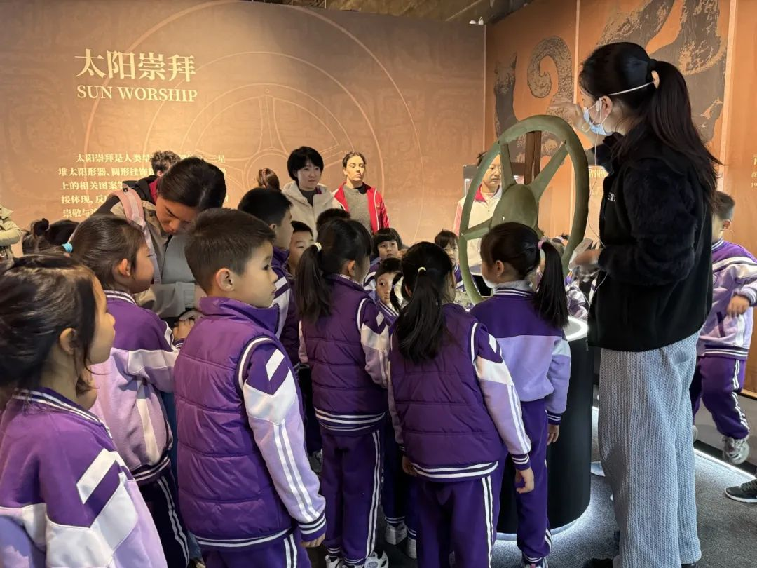 在展館的文物展覽區,孩子們近距離觀賞了黃金面具、青銅神壇、青銅人首鳥身像等三星堆館藏文物的精美復刻品。講解老師用生動有趣的語言,為孩子們打開了一扇通往古蜀文化世界的神秘大門,讓他們身臨其境地感受到了三星堆古蜀文化的深厚底蘊與獨特魅力。