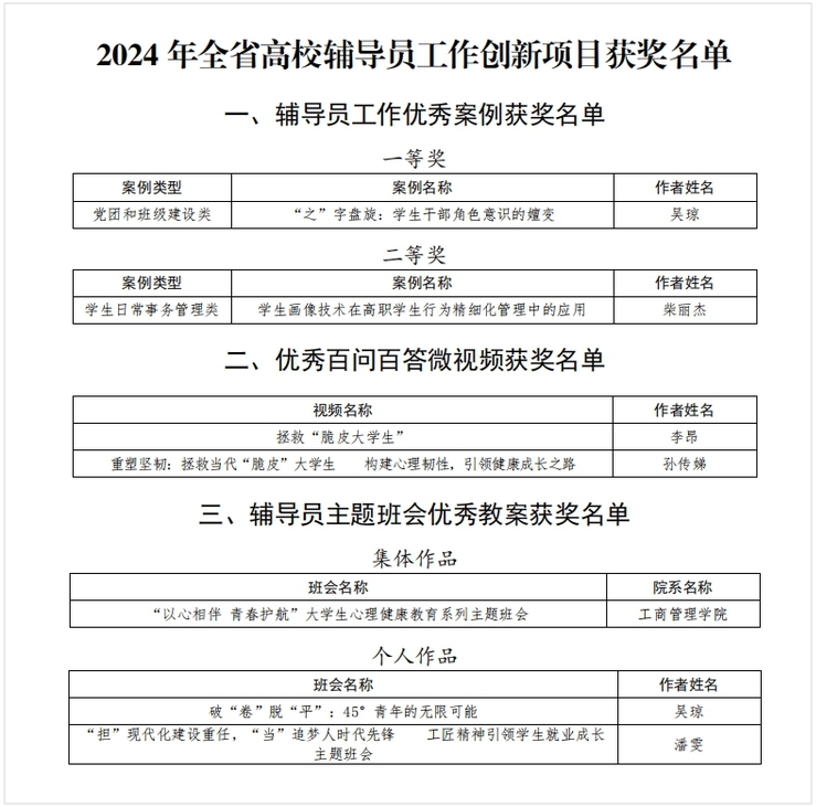 全省高校輔導員工作創新項目評選工作經選拔推薦、專家評審、網上公示等環節,評選出輔導員工作優秀案例、優秀百問百答微視頻、輔導員主題班會優秀教案等獎項。青島酒店管理職院以項目評選為契機,鼓勵輔導員隊伍針對大學生關注的熱點、難點、焦點問題開展工作研究,總結工作經驗,提煉工作方法,推動輔導員隊伍建設提質增效。